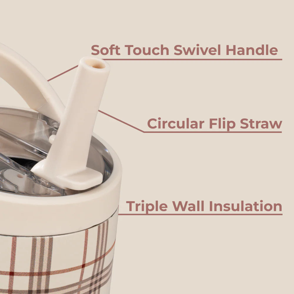 Completely leakproof with the straw down, this tumbler includes a circular flip straw for smooth sipping, plus an ergonomic bucket handle for easy carrying. A protective rubber base prevents scratches and reduces noise, while the dishwasher-safe body makes cleanup simple.