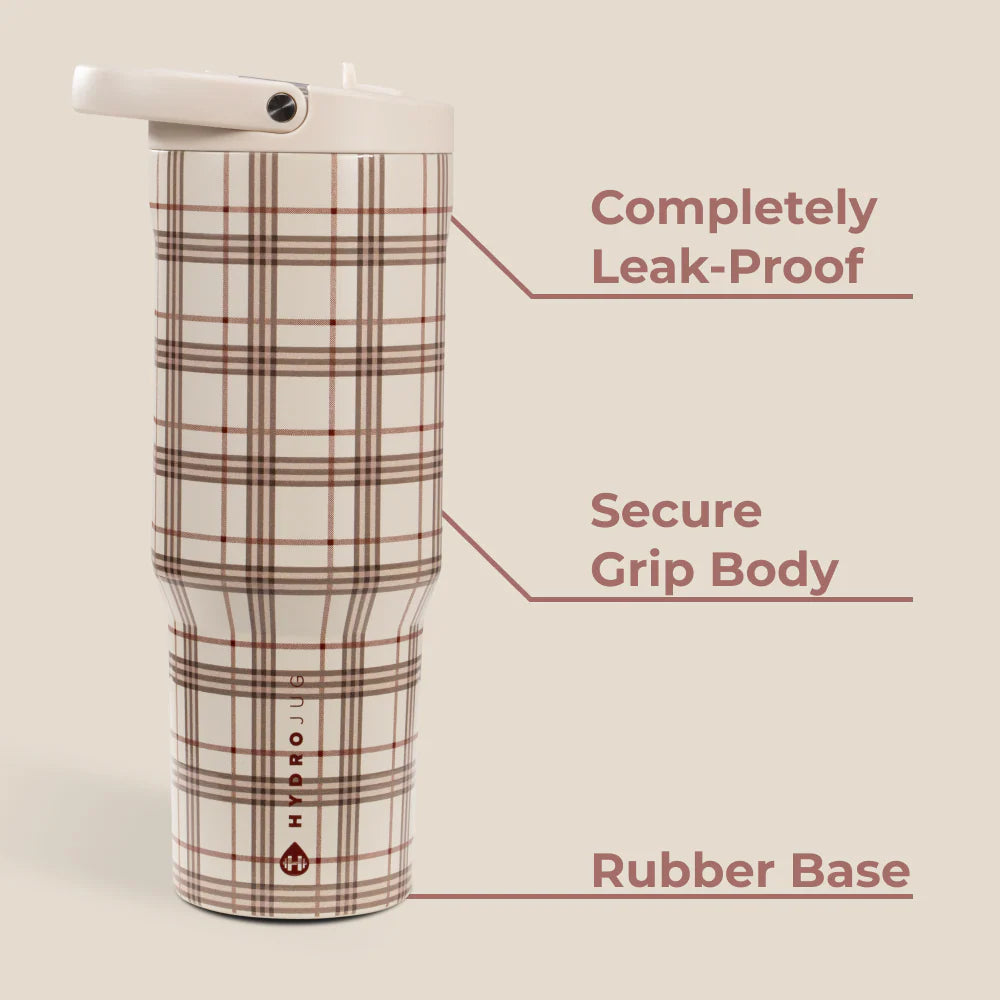 The HydroJug Sport 32oz in Blair delivers hydration for active lifestyles with a timeless look. Its cream base with clean plaid lines offers a versatile style that fits anywhere – from your gym bag to your workday desk.