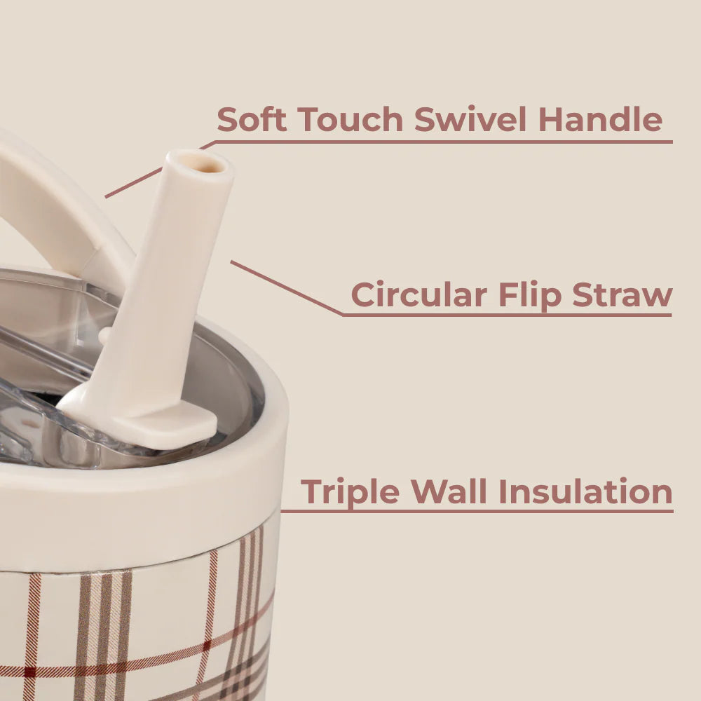 It’s completely leakproof with the straw down, fitted with a circular flip straw for smooth sipping, and cupholder compatible with its tapered base. Ergonomic side grips provide a secure hold, while the bucket handle makes transport easy. A protective rubber base helps reduce noise and protect surfaces, and the dishwasher-safe design ensures quick cleaning.