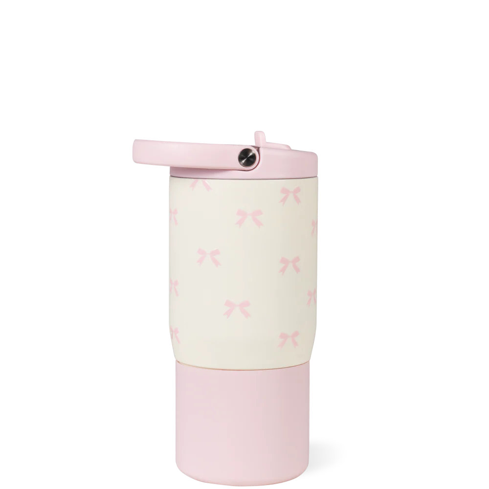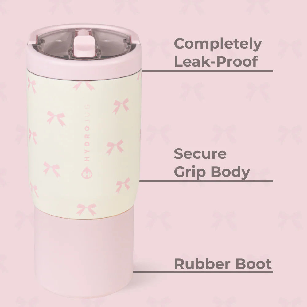 The HydroJug Sport 14oz in Bows is built to keep up with little ones through preschool, playdates, and playground adventures. With its cream base patterned in pale pink bows, this compact water bottle adds a playful design kids will love while delivering the durability parents need.
