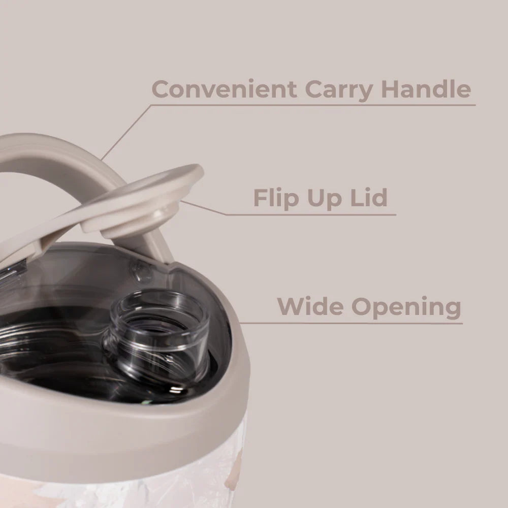 Equipped with a silent shaker grate, you’ll enjoy lump-free mixing without the noise of traditional shakers. The antimicrobial Tritan lid with flip-top cap makes sipping easy, while the sturdy bucket handle ensures comfort on the go. A rubberized no-slip base provides stability and surface protection, and the 24oz capacity gives you the ideal balance between compact size and reliable hydration.