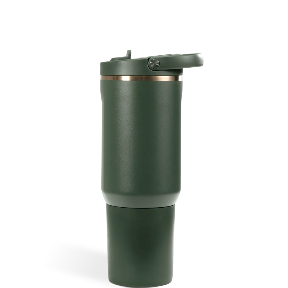 Fully leakproof with the straw down, this tumbler features a circular flip straw for quick sips, ergonomic side grips, and a bucket handle for comfortable transport. A protective rubber base adds durability, while the dishwasher-safe body makes cleaning effortless.