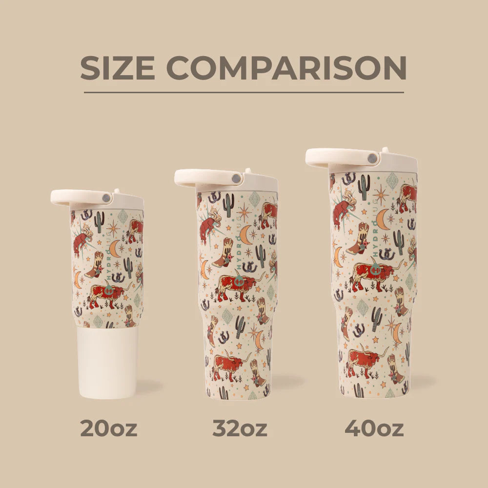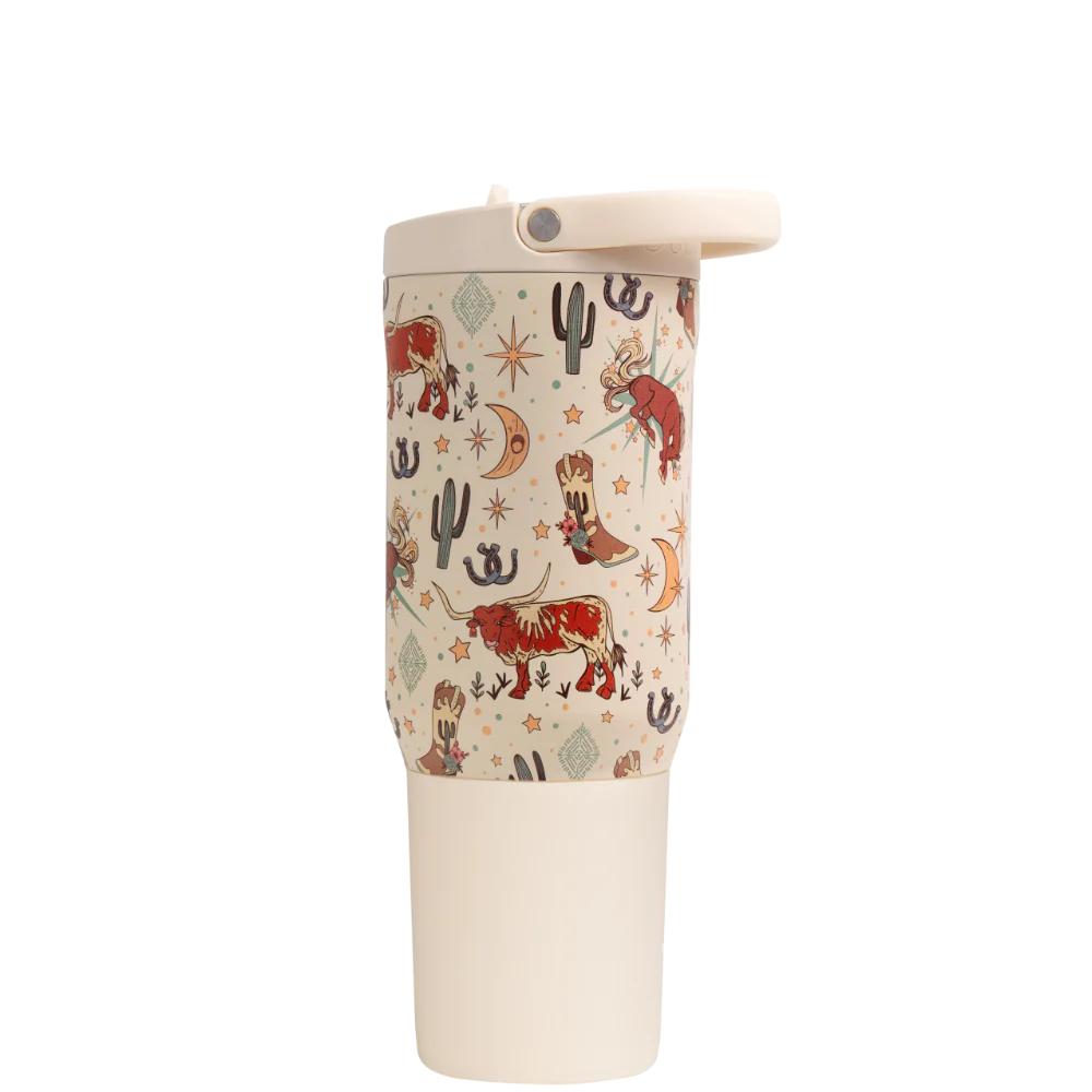 Made for active lifestyles of all ages, the HydroJug Sport 20oz in Rodeo delivers dependable hydration in a compact, portable size. With its cream base decorated with longhorns, boots, cacti, and moons, this water bottle adds a western-inspired design while supporting hydration for kids at school or adults on the go.