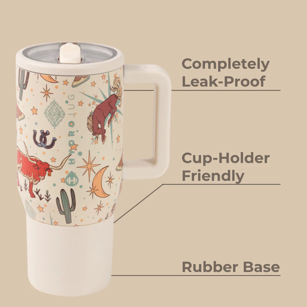 Stay hydrated with the HydroJug Traveler 20oz in Rodeo. With its cream base accented by desert-inspired graphics, this compact water bottle adds a western touch while supporting steady hydration through school days, commutes, or weekend activities.