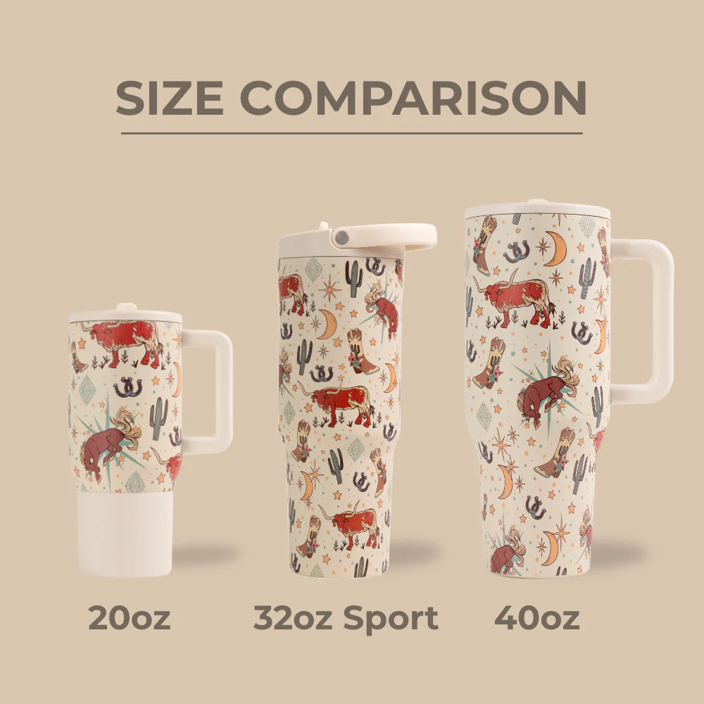 Made to keep up with active lifestyles, the HydroJug Sport 32oz in Rodeo pairs durability with a bold western touch. With its cream base decorated with longhorns, boots, cacti, stars, and moons, this insulated bottle delivers dependable hydration for workouts, commutes, or time outdoors.