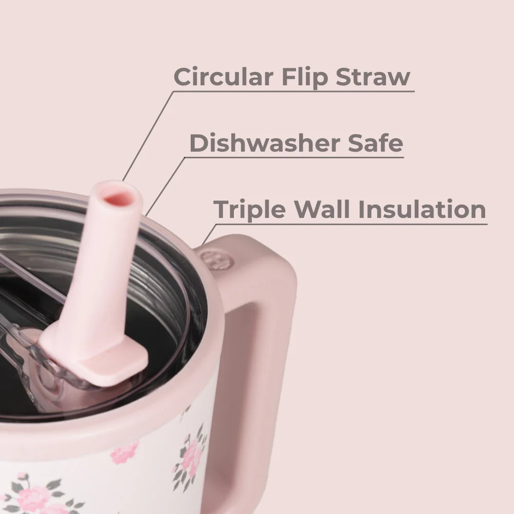For convenience, it’s completely leakproof with the straw down, equipped with a flip-straw lid for easy sipping, and designed with a cupholder-friendly base. An ergonomic handle makes it simple to carry, while the dishwasher-safe design ensures quick and effortless cleaning.